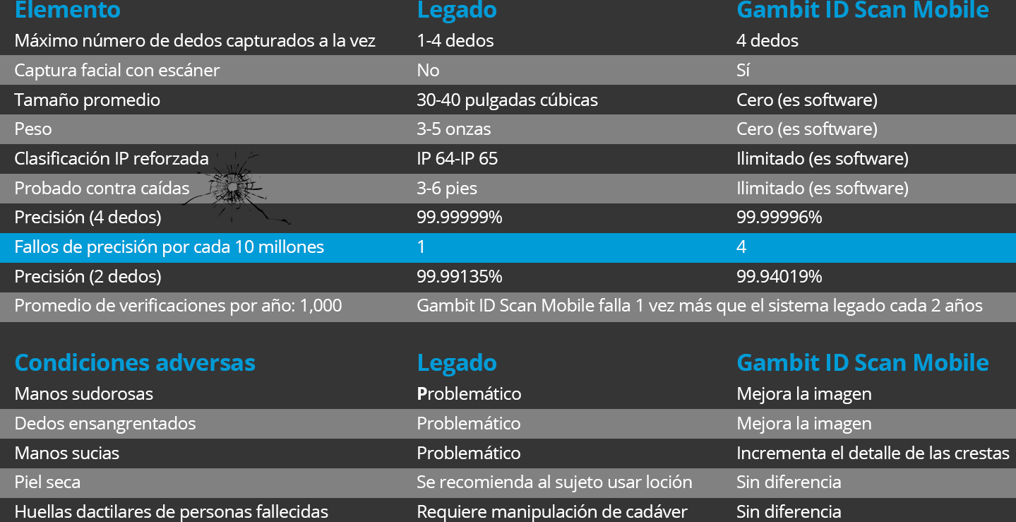 Con tecnología innovadora que convierte a cada usuario en un sensor biométrico, Gambit ID Scan Mobile es una aplicación comprobada, patentada y resistente al combate para la toma de huellas digitales sin contacto y otras biometrías empleadas por el Departamento de Defensa, agencias estatales, locales y federales de seguridad.